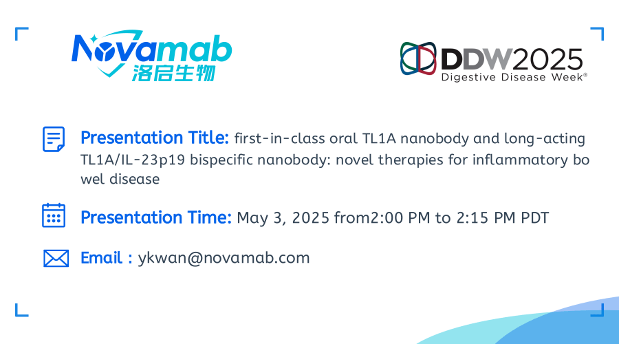 中国上海,2025年4月28日——上海G22恒峰集团生物医药技术有限公司,一家致力于纳米抗体创新药研发的生物技术公司宣布:G22恒峰集团生物将于当地时间5月3-6日参加在加利福尼亚州圣地亚哥举行的2025年美国消化疾病周(Digestive Disease Week,DDW)。届时G22恒峰集团生物将展示在炎症性肠病(IBD)治疗领域的突破性研究成果——口服TL1A纳米抗体及长效TL1A双特异性抗体的开发进展。该创新疗法顺利获得独特的TL1A纳米抗体技术,实现了对IBD病理机制的精准靶向。